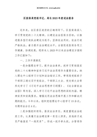 / 【七哥公文】2024年:区医保局党组书记、局长2023年度述法报告+更多免费公文+VX:QiGeGongWen2024