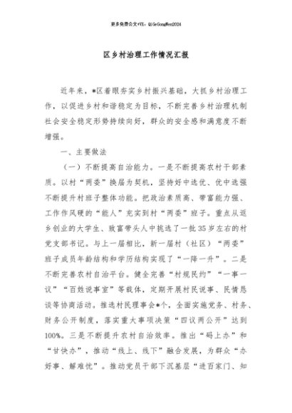 / 【七哥公文】2024年:区乡村治理工作情况汇报+更多免费公文+VX:QiGeGongWen2024