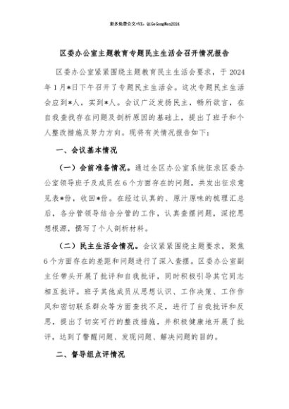 / 【七哥公文】2024年:区委办公室主题教育专题民主生活会召开情况报告+更多免费公文+VX:QiGeGongWen2024