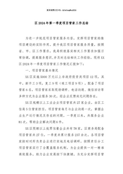 / 【七哥公文】2024年:区2024年第一季度项目管家工作总结+更多免费公文+VX:QiGeGongWen2024