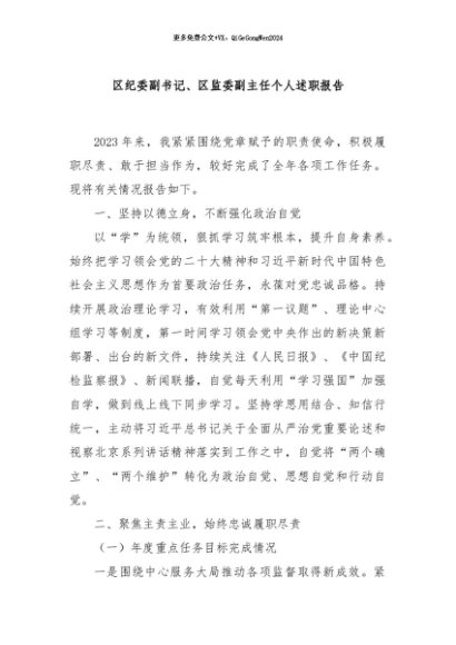 / 【七哥公文】2024年:区纪委副书记、区监委副主任个人述职报告+更多免费公文+VX:QiGeGongWen2024