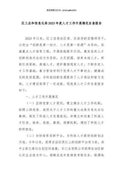 【七哥公文】2024年:区工业和信息化局2023年度人才工作开展情况自查报告+更多免费公文+VX:QiGeGongWen2024