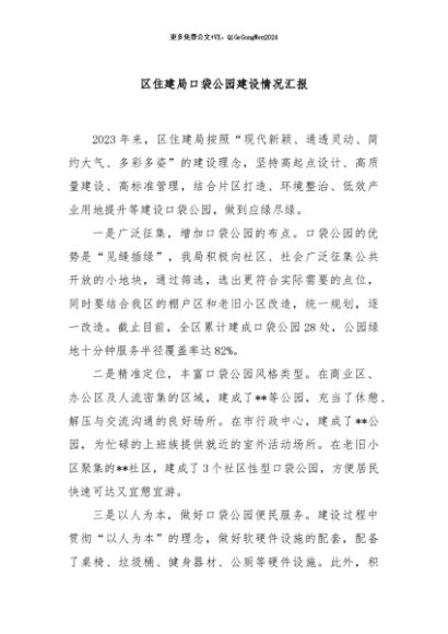 / 【七哥公文】2024年:区住建局口袋公园建设情况汇报+更多免费公文+VX:QiGeGongWen2024