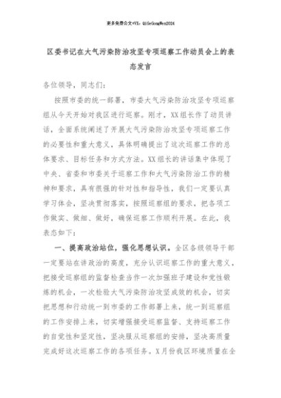 【七哥公文】2024年:区委书记在大气污染防治攻坚专项巡察工作动员会上的表态发言+更多免费公文+VX:QiGeGongWen2024