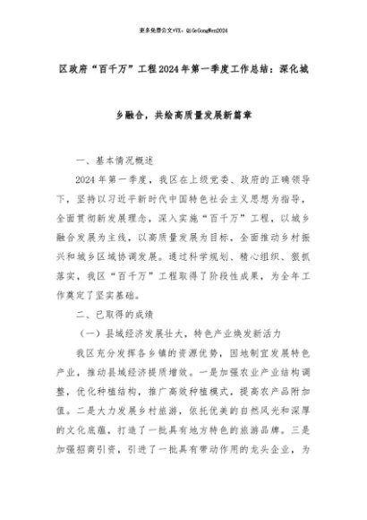 【七哥公文】2024年:区政府“百千万”工程2024年第一季度工作总结:深化城乡融合,共绘高质量发展新篇章+更多免费公文+VX:QiGeGongWen2024