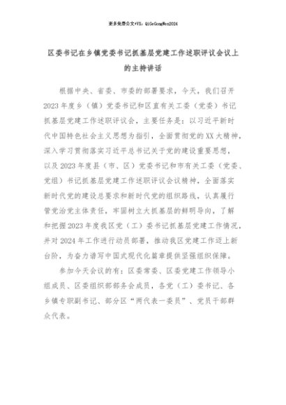 【七哥公文】2024年:区委书记在乡镇党委书记抓基层党建工作述职评议会议上的主持讲话+更多免费公文+VX:QiGeGongWen2024