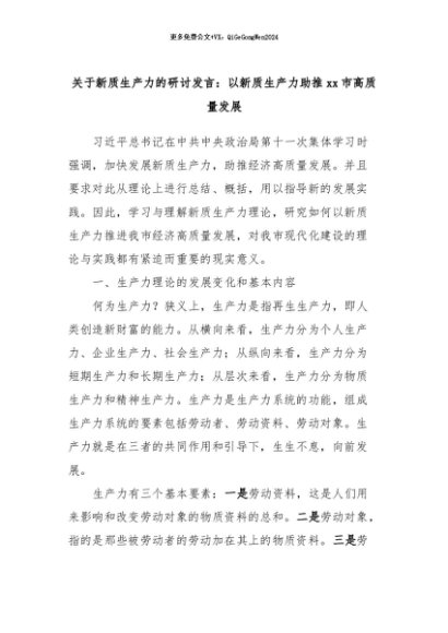 【七哥公文】2024年:关于新质生产力的研讨发言:以新质生产力助推xx市高质量发展+更多免费公文+VX:QiGeGongWen2024