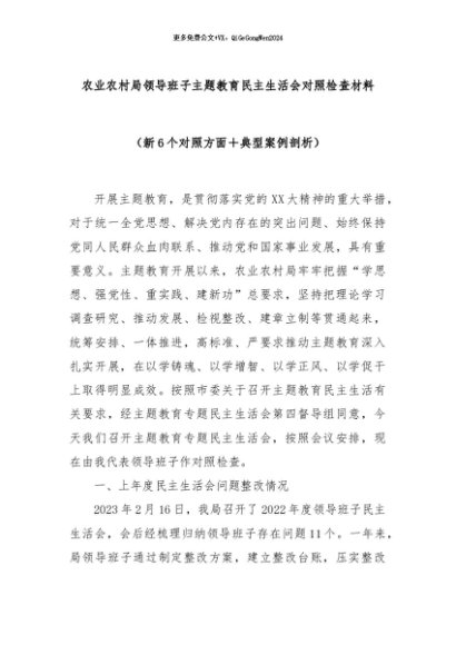 【七哥公文】2024年:农业农村局领导班子主题教育民主生活会对照检查材料(新6个对照方面+典型案例剖析)+更多免费公文+VX:QiGeGongWen2024