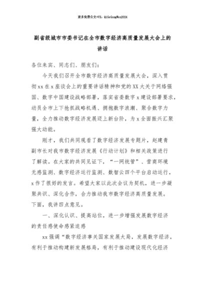 【七哥公文】2024年:副省级城市市委书记在全市数字经济高质量发展大会上的讲话+更多免费公文+VX:QiGeGongWen2024