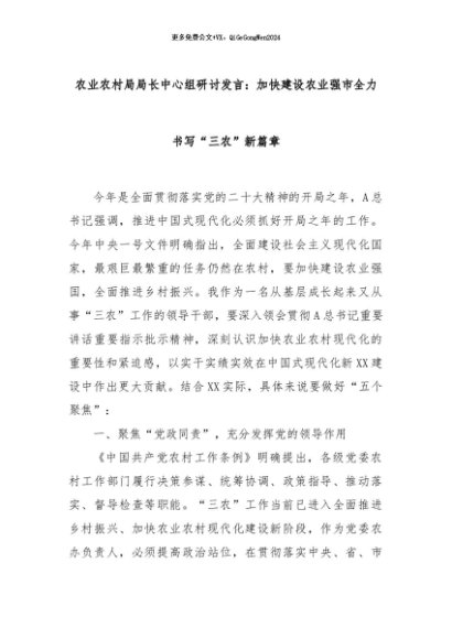 【七哥公文】2024年:农业农村局局长中心组研讨发言:加快建设农业强市全力书写“三农”新篇章+更多免费公文+VX:QiGeGongWen2024