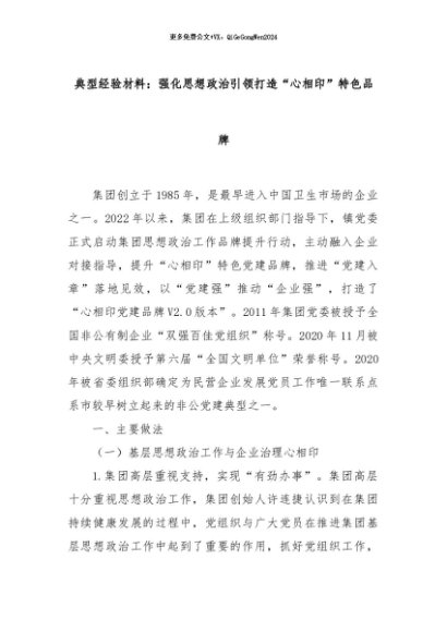 【七哥公文】2024年:典型经验材料:强化思想政治引领打造“心相印”特色品牌+更多免费公文+VX:QiGeGongWen2024