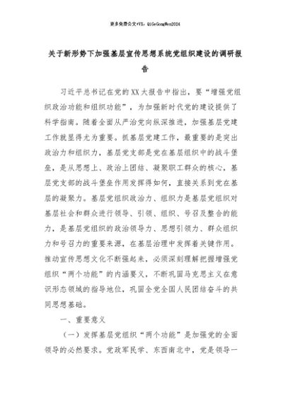 【七哥公文】2024年:关于新形势下加强基层宣传思想系统党组织建设的调研报告+更多免费公文+VX:QiGeGongWen2024