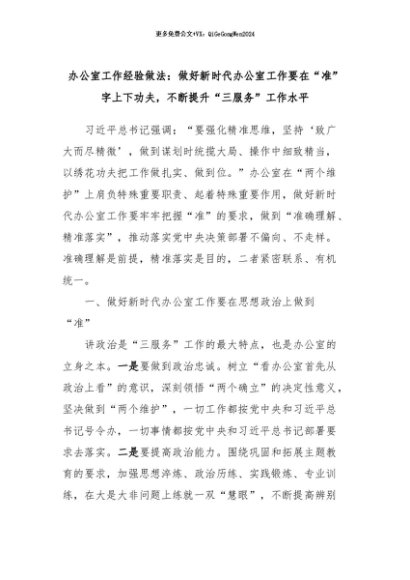【七哥公文】2024年:办公室工作经验做法:做好新时代办公室工作要在“准”字上下功夫,不断提升“三服务”工作水平+更多免费公文+VX:QiGeGongWen2024