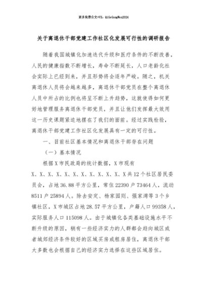 / 【七哥公文】2024年:关于离退休干部党建工作社区化发展可行性的调研报告+更多免费公文+VX:QiGeGongWen2024
