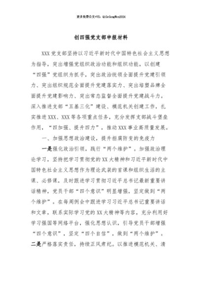 【七哥公文】2024年:创四强党支部申报材料+更多免费公文+VX:QiGeGongWen2024