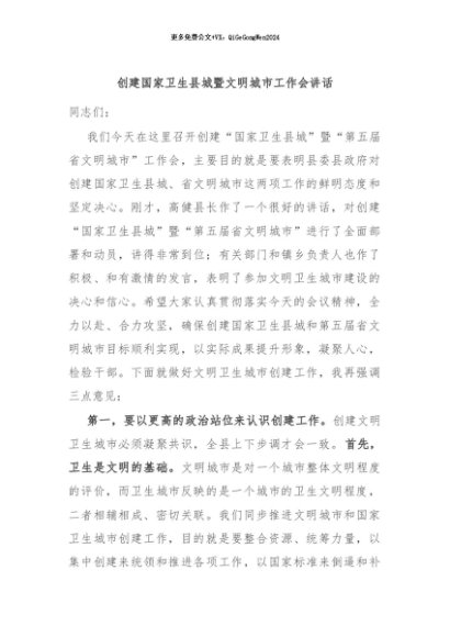 / 【七哥公文】2024年:创建国家卫生县城暨文明城市工作会讲话+更多免费公文+VX:QiGeGongWen2024