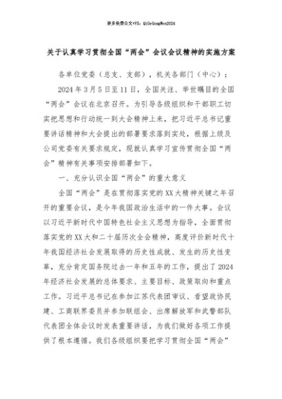/ 【七哥公文】2024年:关于认真学习贯彻全国“两会”会议会议精神的实施方案+更多免费公文+VX:QiGeGongWen2024