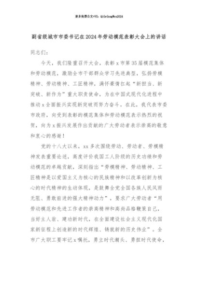 【七哥公文】2024年:副省级城市市委书记在2024年劳动模范表彰大会上的讲话+更多免费公文+VX:QiGeGongWen2024