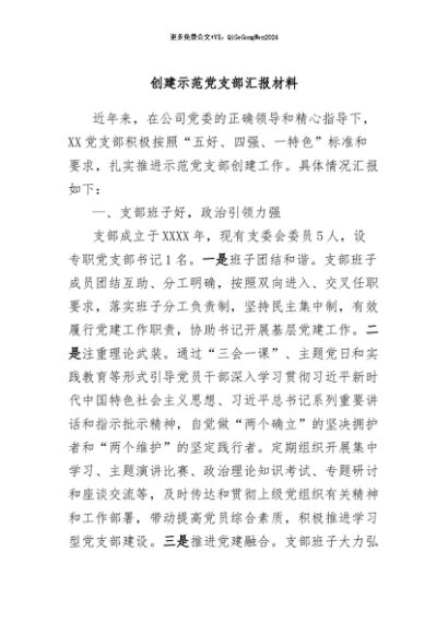 / 【七哥公文】2024年:创建示范党支部汇报材料+更多免费公文+VX:QiGeGongWen2024