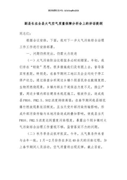 / 【七哥公文】2024年:副县长在全县大气空气质量保障分析会上的讲话提纲+更多免费公文+VX:QiGeGongWen2024