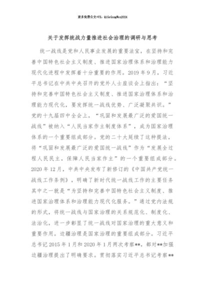 / 【七哥公文】2024年:关于发挥统战力量推进社会治理的调研与思考+更多免费公文+VX:QiGeGongWen2024