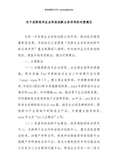 / 【七哥公文】2024年:关于发挥我市企业科技创新主体作用的对策建议+更多免费公文+VX:QiGeGongWen2024