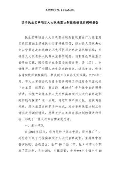 / 【七哥公文】2024年:关于民生实事项目人大代表票决制推进情况的调研报告+更多免费公文+VX:QiGeGongWen2024