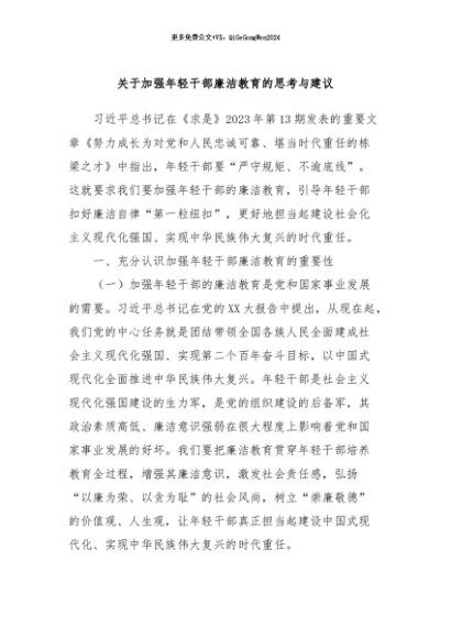 / 【七哥公文】2024年:关于加强年轻干部廉洁教育的思考与建议+更多免费公文+VX:QiGeGongWen2024