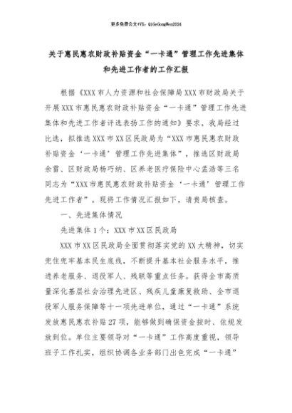【七哥公文】2024年:关于惠民惠农财政补贴资金“一卡通”管理工作先进集体和先进工作者的工作汇报+更多免费公文+VX:QiGeGongWen2024