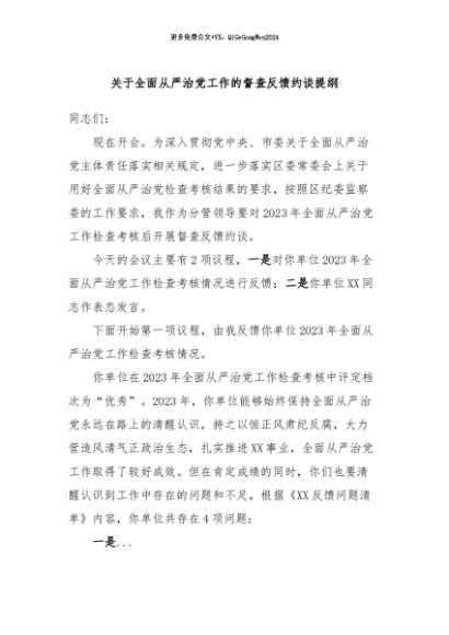 / 【七哥公文】2024年:关于全面从严治党工作的督查反馈约谈提纲+更多免费公文+VX:QiGeGongWen2024