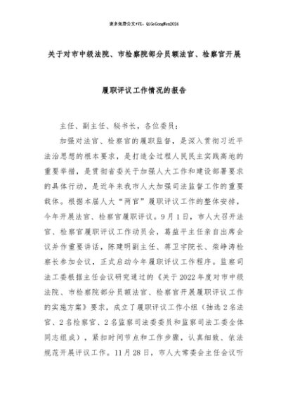 【七哥公文】2024年:关于对市中级法院、市检察院部分员额法官、检察官开展履职评议工作情况的报告+更多免费公文+VX:QiGeGongWen2024