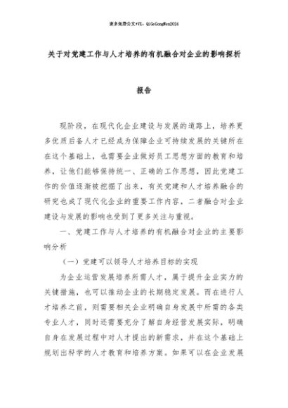 【七哥公文】2024年:关于对党建工作与人才培养的有机融合对企业的影响探析报告+更多免费公文+VX:QiGeGongWen2024