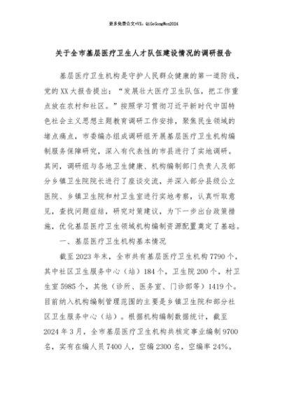 / 【七哥公文】2024年:关于全市基层医疗卫生人才队伍建设情况的调研报告+更多免费公文+VX:QiGeGongWen2024