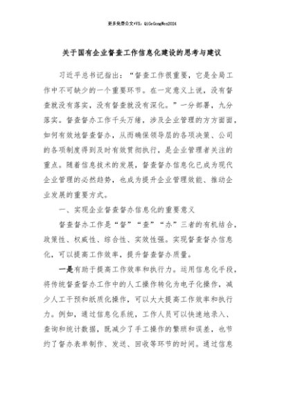 / 【七哥公文】2024年:关于国有企业督查工作信息化建设的思考与建议+更多免费公文+VX:QiGeGongWen2024