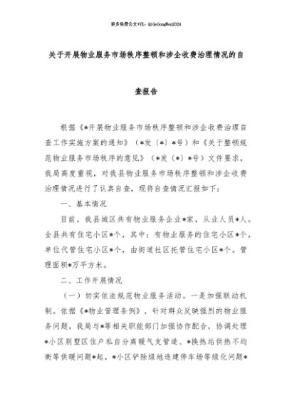 【七哥公文】2024年:关于开展物业服务市场秩序整顿和涉企收费治理情况的自查报告+更多免费公文+VX:QiGeGongWen2024