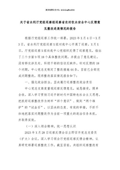 【七哥公文】2024年:关于省水利厅党组巡察组巡察省农村饮水安全中心反馈意见整改进展情况的报告+更多免费公文+VX:QiGeGongWen2024