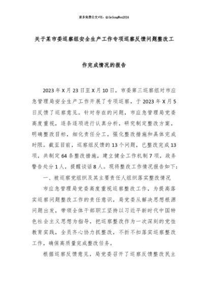 【七哥公文】2024年:关于某市委巡察组安全生产工作专项巡察反馈问题整改工作完成情况的报告+更多免费公文+VX:QiGeGongWen2024