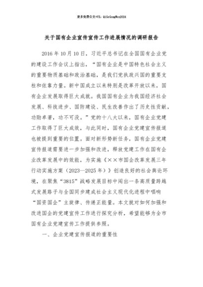 / 【七哥公文】2024年:关于国有企业宣传宣传工作进展情况的调研报告+更多免费公文+VX:QiGeGongWen2024