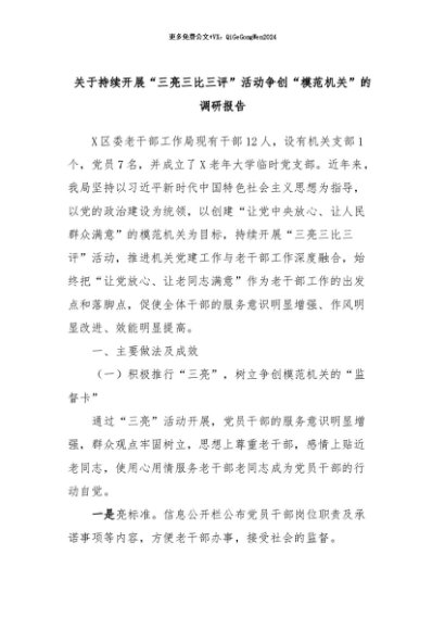 【七哥公文】2024年:关于持续开展“三亮三比三评”活动争创“模范机关”的调研报告+更多免费公文+VX:QiGeGongWen2024