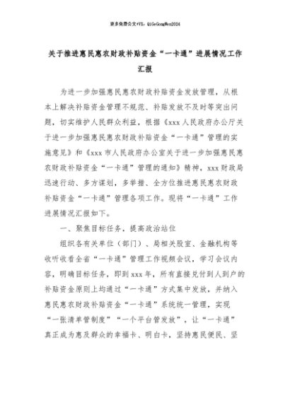 【七哥公文】2024年:关于推进惠民惠农财政补贴资金“一卡通”进展情况工作汇报+更多免费公文+VX:QiGeGongWen2024