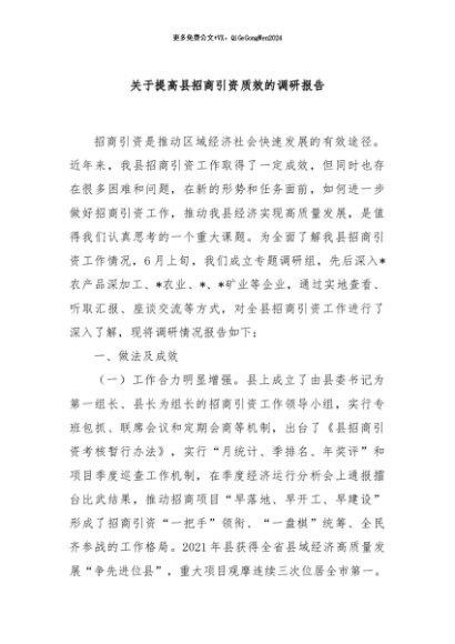 / 【七哥公文】2024年:关于提高县招商引资质效的调研报告+更多免费公文+VX:QiGeGongWen2024