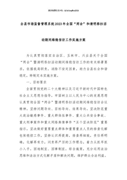 【七哥公文】2024年:全县市场监督管理系统2023年全国“两会”和清明祭扫活动期间维稳信访工作实施方案+更多免费公文+VX:QiGeGongWen2024