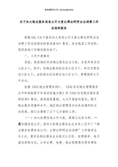 【七哥公文】2024年:关于加大物业服务信息公开力度让群众明明白白消费工作总结的报告+更多免费公文+VX:QiGeGongWen2024