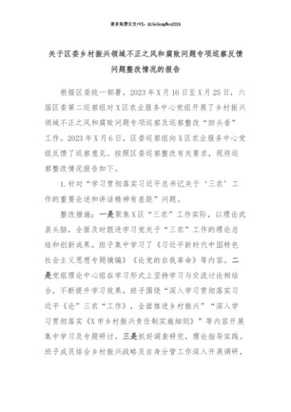 【七哥公文】2024年:关于区委乡村振兴领域不正之风和腐败问题专项巡察反馈问题整改情况的报告+更多免费公文+VX:QiGeGongWen2024