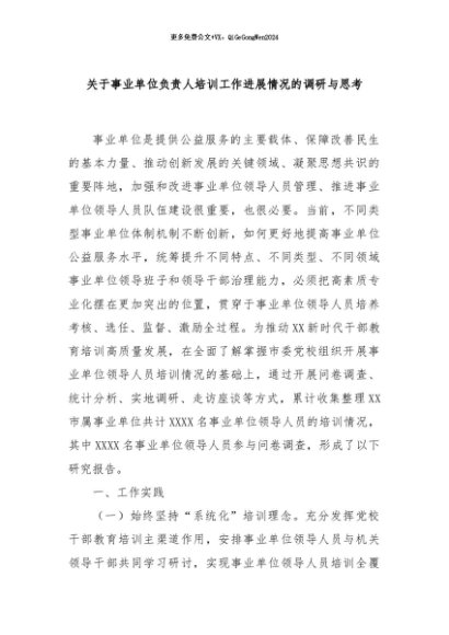 / 【七哥公文】2024年:关于事业单位负责人培训工作进展情况的调研与思考+更多免费公文+VX:QiGeGongWen2024