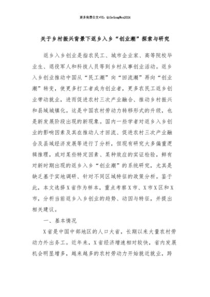 / 【七哥公文】2024年:关于乡村振兴背景下返乡入乡“创业潮”探索与研究+更多免费公文+VX:QiGeGongWen2024
