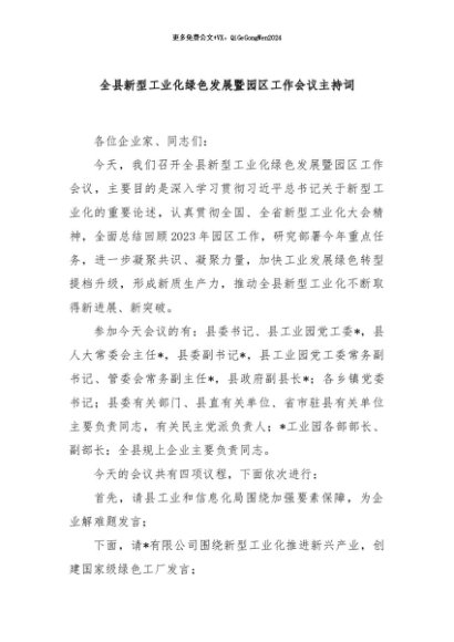 / 【七哥公文】2024年:全县新型工业化绿色发展暨园区工作会议主持词+更多免费公文+VX:QiGeGongWen2024