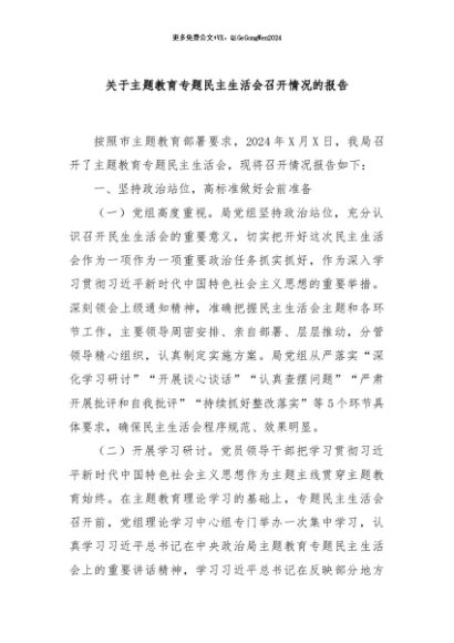 / 【七哥公文】2024年:关于主题教育专题民主生活会召开情况的报告+更多免费公文+VX:QiGeGongWen2024