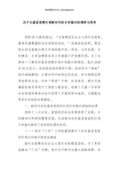 / 【七哥公文】2024年:关于以基层党建引领新时代的乡村振兴的调研与思考+更多免费公文+VX:QiGeGongWen2024