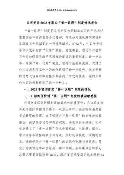 / 【七哥公文】2024年:公司党委2023年落实“第一议题”制度情况报告+更多免费公文+VX:QiGeGongWen2024